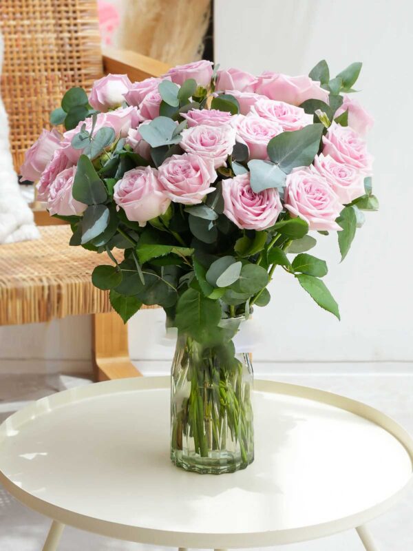 This special bouquet is a perfect choice to give as a beautiful gift to your special someone, whether it be your partner, spouse, friend, or family member. The impressive pink roses are arranged with an elegant vase that will blend in seamlessly with any home decor.